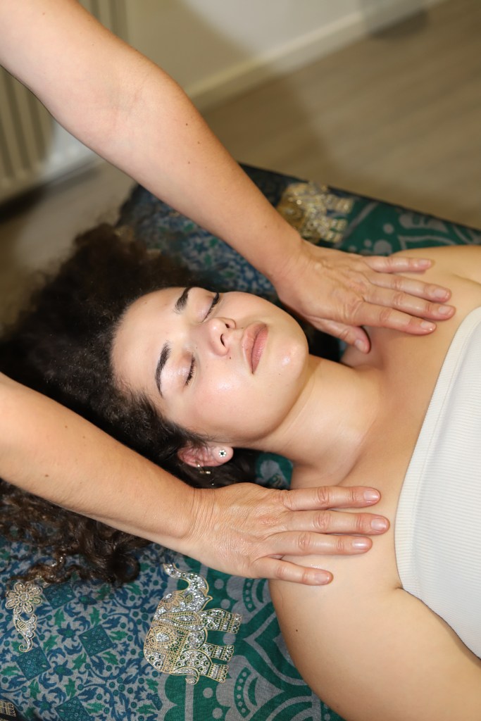 Le praticien appose ses mains avec des positions précises sur l’ensemble du corps de la personne vêtue et allongée sur la table de massage.